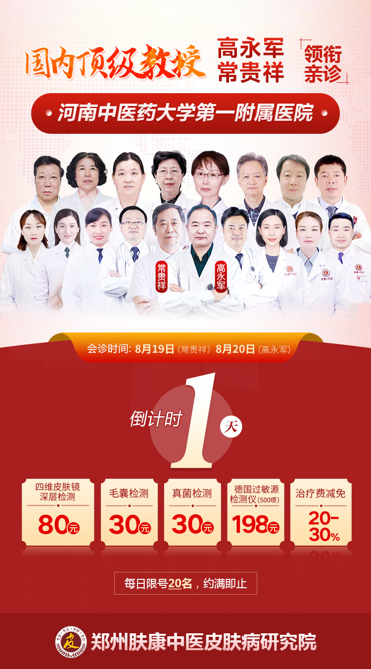 本周末专家会诊说明:8月19日至20日,郑州肤康中医皮肤病研究院,特邀北京市第一中西医结合医院【常贵祥、高永军】教授联合会诊,会诊期间,专家号每日仅限20名,从速预约,约满即止。