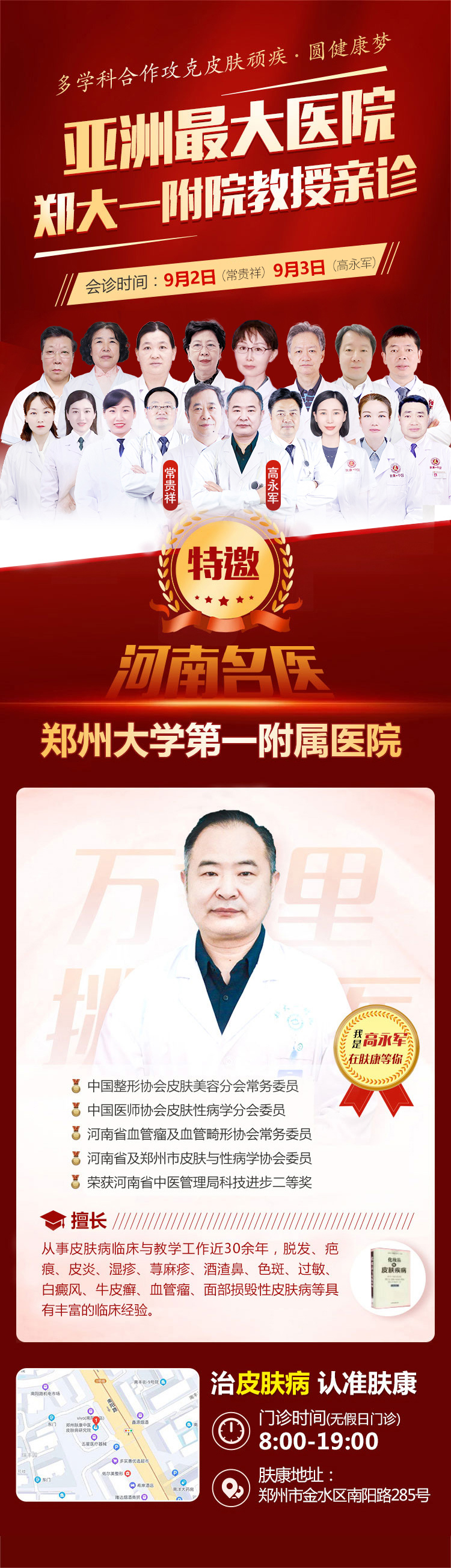 为让河南广大皮肤病患者得到专业、规范的治疗,郑州肤康皮肤病医院特邀河南中医药大学第一附属医院常贵祥教授、郑州大学第一附属医院高永军教授于9月2-3日临我院会诊。望借此机会切实帮助皮肤病患者治疗得当,提高诊疗效果