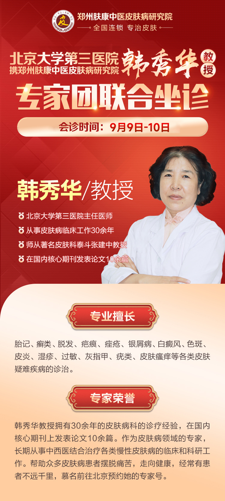 为积极应对秋季皮肤病就诊高峰,让省内诸多皮肤病患者得到及时高效的治疗,我院特邀北京大学第三医院韩秀华教授于本月9月9日、10日莅临肤康亲诊!