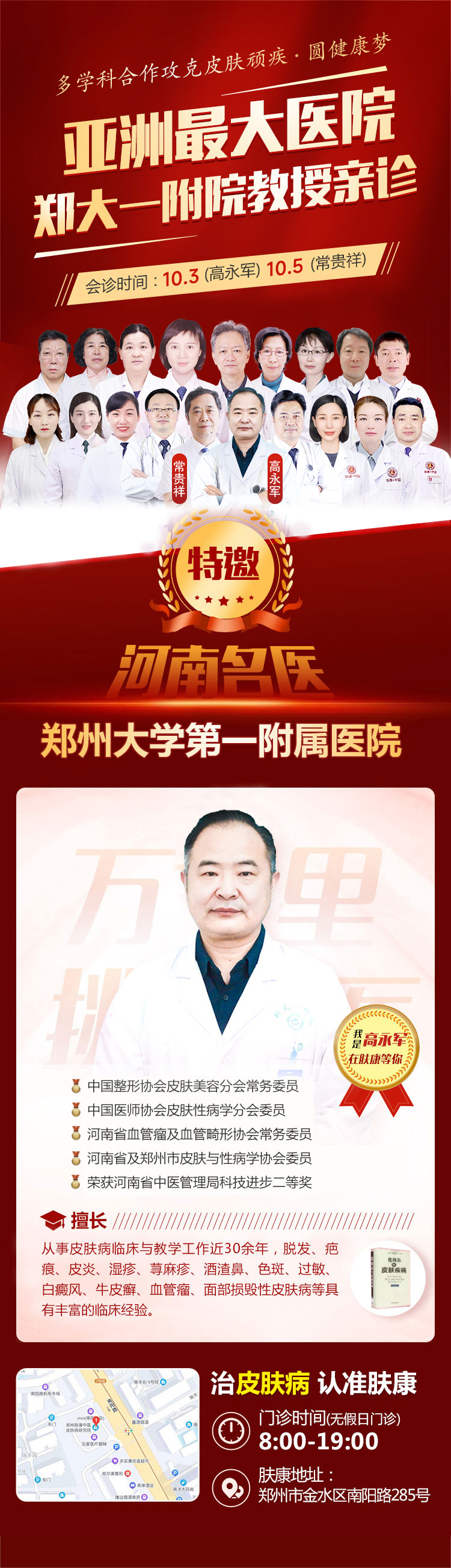 特邀常贵祥教授、高永军教授于10月3-5日莅临郑州肤康会诊。