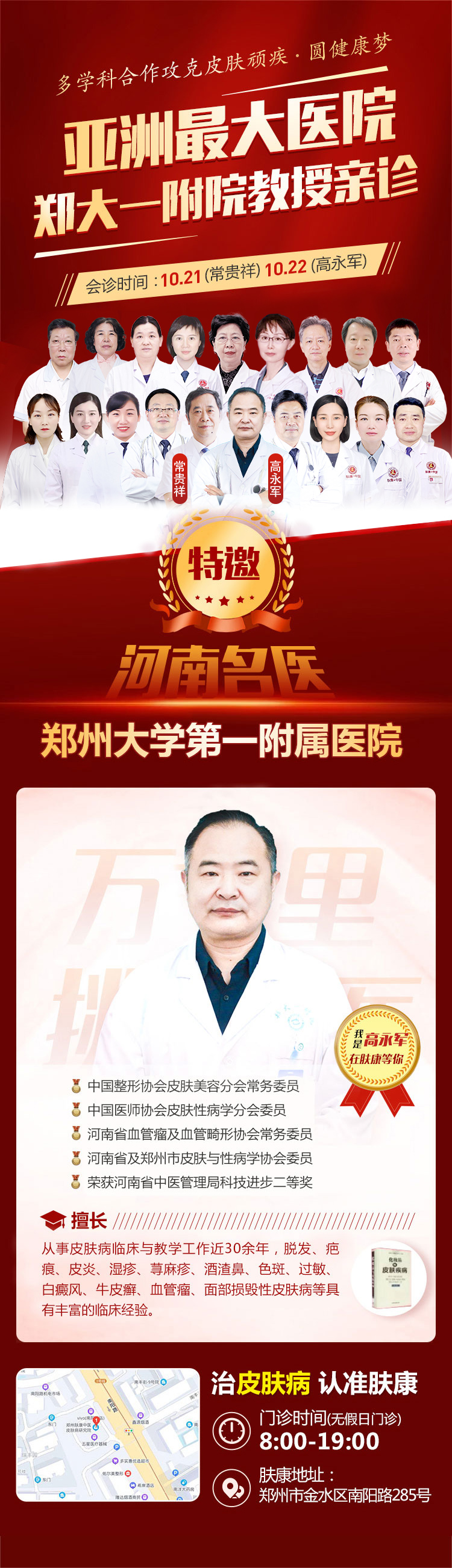 特邀常贵祥教授、高永军教授于10月21-22日莅临郑州肤康会诊。