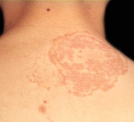 症状:它发于面、颈、躯干和四肢等部位的癣。古医籍称之为圆癣、钱癣。本病西医也称为体癣。初发时为小的丘疹,逐渐向外扩大,中心有自行合的倾向,呈圆形或多环形,在四周有丘疹,水疱,结痂或鳞屑组成的高出于皮面的环状边缘,境界清楚,多发生于面、颈、躯干和四肢等处,自觉搔痒。