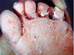 3、角化过度型常见于足、足跖及其侧缘。角质层增厚、粗糙、脱屑、干燥。自觉症状轻微。每到冬季,易发生皲裂。本型常发生于病期较长、年龄较长患者。