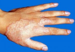 ★手癣男女老幼均可以染病,多发单侧,也可以波及双手。夏天起水疱病情加重,冬天则枯裂疼痛明显。初起为掌心或指缝水疱或掌部皮肤角化脱屑,水疱多透明如晶,瘙痒难忍。水疱破溃后干枯,叠起白屑,中心向,四周激发疱疹,并可延及手背、手腕部。若反作后,致手掌皮肤肥厚,枯槁干裂,疼痛,屈伸不利,宛如鹅掌。若侵及指甲,可使甲板增厚或萎缩翘起,色灰白而成灰指甲(甲藓)。鹅掌风病程为慢性,反作。